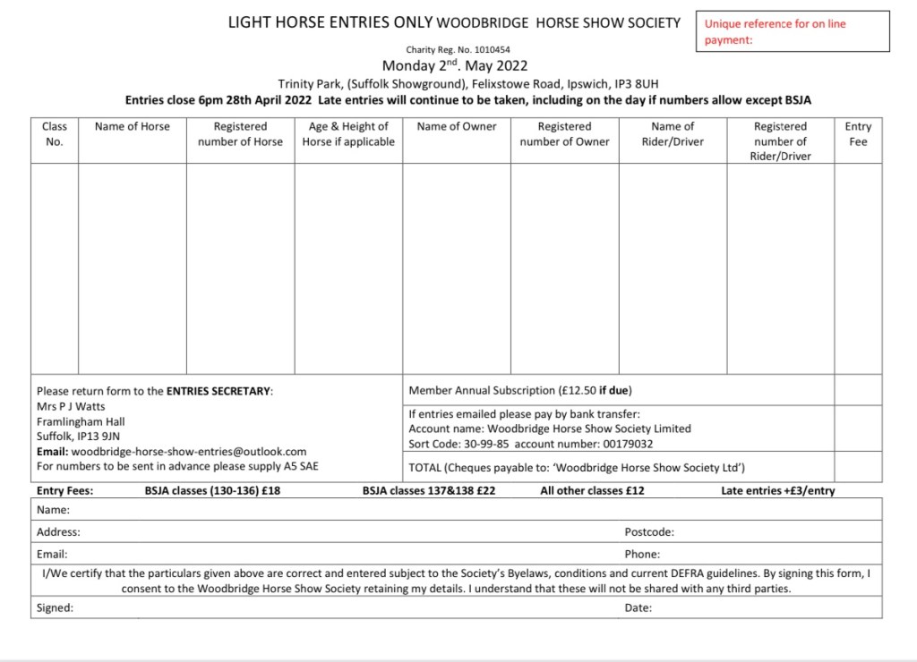 Please remember that the closing date for Suffolk Horse entries is 8th April 2022. Late entries will NOT be accepted.